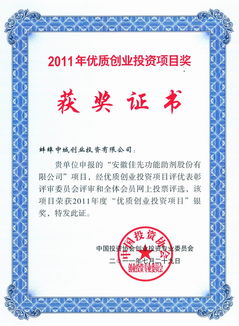 729,在首屆中國創(chuàng )業(yè)投資行業(yè)峰會(huì )暨評優(yōu)表彰頒獎儀式上,蚌埠中城創(chuàng )業(yè)投資有限公司(下稱(chēng)中城創(chuàng )投)申報的“安徽佳先功能助劑股份有限公司”項目,經(jīng)優(yōu)質(zhì)創(chuàng )業(yè)投資項目評優(yōu)表彰評審委員會(huì )評審和全體會(huì )員網(wǎng)上投票評選,榮獲2011年度“優(yōu)質(zhì)創(chuàng )業(yè)投資項目”銀獎。