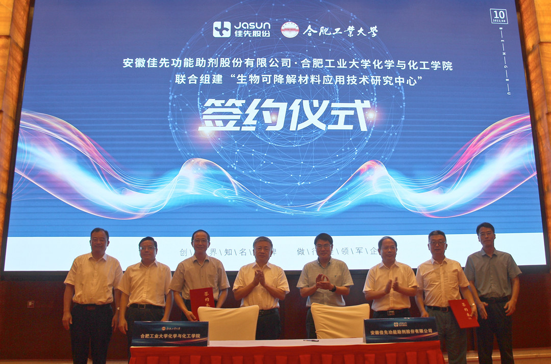 8月10日,安徽佳先功能助劑股份有限公司與合肥工業(yè)大學(xué)化學(xué)與化工學(xué)院聯(lián)合組建“生物可降解材料應用技術(shù)研究中...